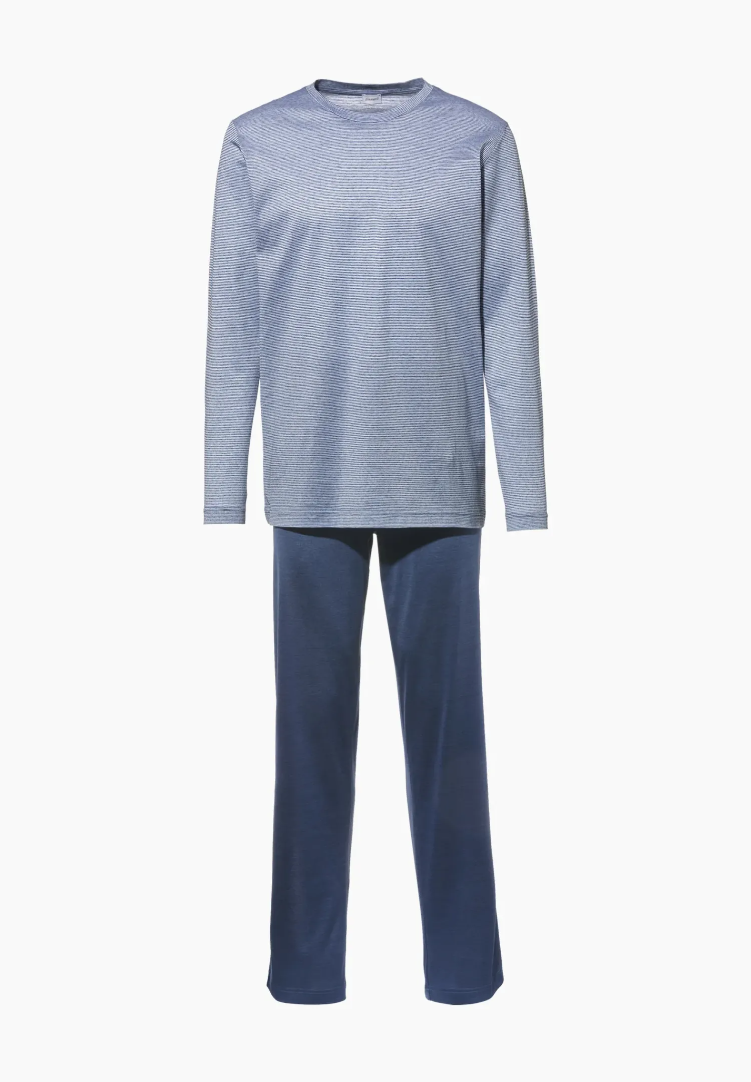 Edler Schimmer Trifft Auf Schmale Streifen In Unifarben Und Melange. Der Lange Schlafanzug Fur Herren Uberzeugt Durch Den Seidigen Glanz. Das Gestreifte Schlafanzug-Oberteil Mit Langen Armeln Besitzt Einen Rundhals-Ausschnitt. Die Streifen Sind Detailreich Gestrickt: Es Wechseln Sich Sehr Dunne Streifen In Uni Mit Dezenten Melange-Streifen Ab. Der Saum Am Eingesetzten Halsausschnitt Ist Ebenfalls Gestreift. Die Pyjama Pants Sind Einfarbig, Genau Passend Zur Farbe Des Dessins. Die Lange Hose Besitzt Einen Verdeckten, Elastischen Bund, Ist Gerade Geschnitten Und Sehr Bequem Zu Tragen.