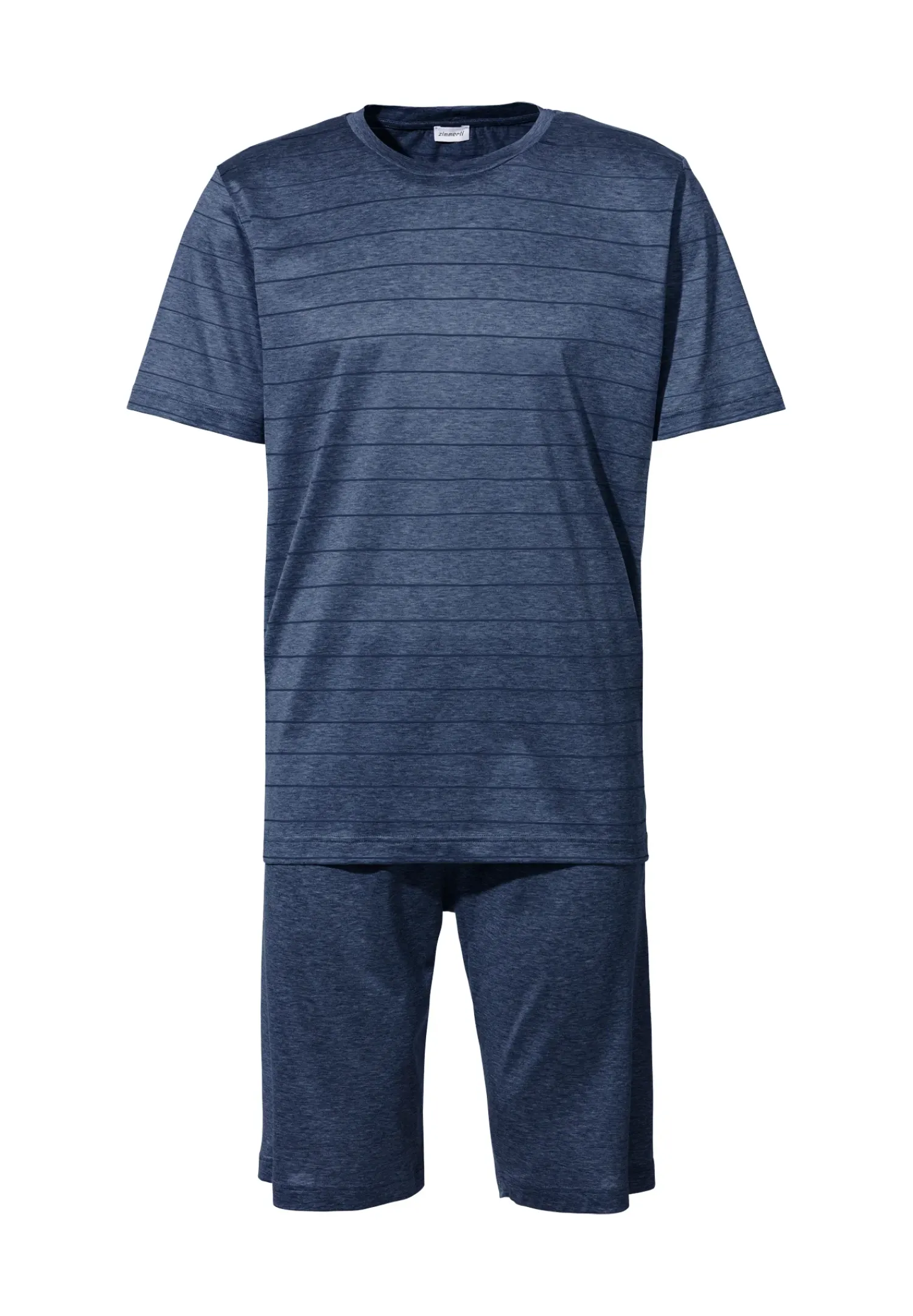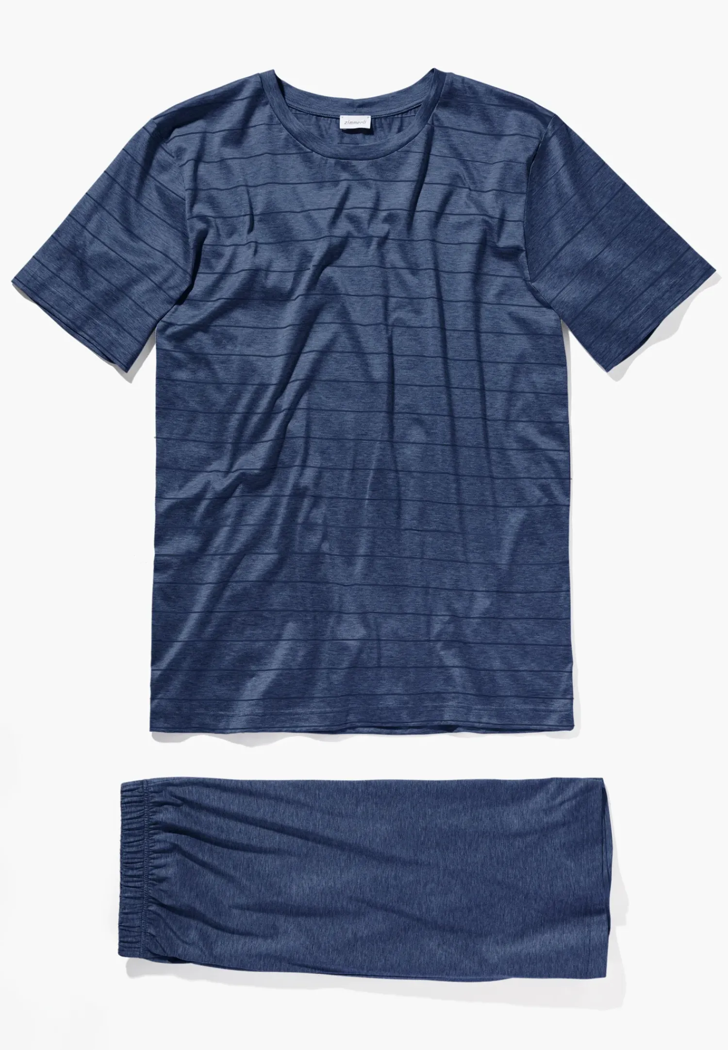Edler Schimmer Trifft Auf Schmale Streifen In Unifarben Und Melange. Der Kurze Schlafanzug Fur Herren Uberzeugt Durch Den Seidigen Glanz. Das Gestreifte Schlafanzug-Oberteil Mit Kurzen Armeln Besitzt Einen Eingesetzten Rundhals-Ausschnitt. Die Streifen Sind Detailreich Gestrickt: Es Wechseln Sich Sehr Dunne Streifen In Uni Mit Breiten Melange-Streifen Ab. Die Pyjama Shorts Sind Einfarbig, Genau Passend Zur Farbe Des Dessins. Die Kurze Hose Besitzt Einen Verdeckten, Elastischen Bund, Ist Gerade Geschnitten Und Sehr Bequem Zu Tragen.