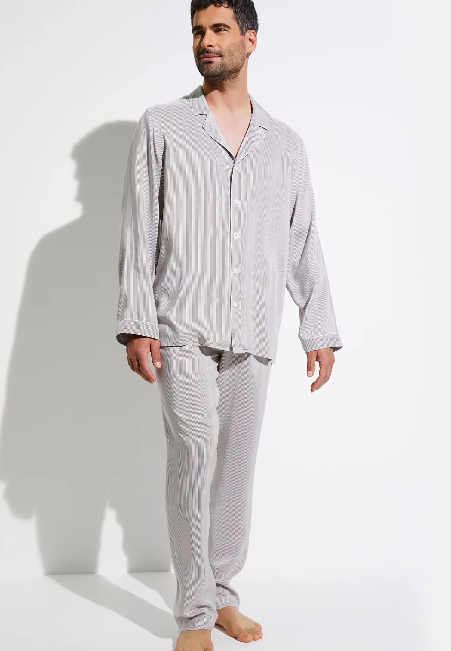 Kuhle, Glatte Viskose Wird Gemeinsam Mit Luxurioser Seide Zu Besonders Ebenmassigen Stoff Gewebt Und Mit Einem Dezenten, Schmalen Langsstreifenmuster Verziert. Der Lange Pyjama Fur Herren Mit Langen Armeln Und Langer Hose Uberzeugt Als Kleines Highlight Mit Dezenten Paspelierungen In Weiss. Das Schlafanzug-Oberteil Besitzt Einen Reverskragen Und Wird Per Durchgehender Knopfleiste Mit Funf Perlmutt-Knopfen Geschlossen. Der Kragen Und Die Umschlage An Den Armelenden Sind Mit Der Weissen Paspel Abgesetzt. Auf Der Ruckseite Des Hemds Ist Eine Vom Kragen An Abwarts Fliessende Falte Angebracht. Die Lange Schlafhose Ist Gerade, Weit Und Locker Geschnitten. Das Verdeckte Bundband Ist Weich Und Flexibel Und Verlauft Bis Fast An Die Vordere Mitte. Auf Der Vorderseite Besitzt Die Hose Einen Eingriff, Der Mit Einem Sichtbaren Sowie Einem Unsichtbaren Knopf Verschlossen Wird. Der Schnitt Ist Locker Und Bequem, Der Webstoff Ist Fest Und Nicht Elastisch.