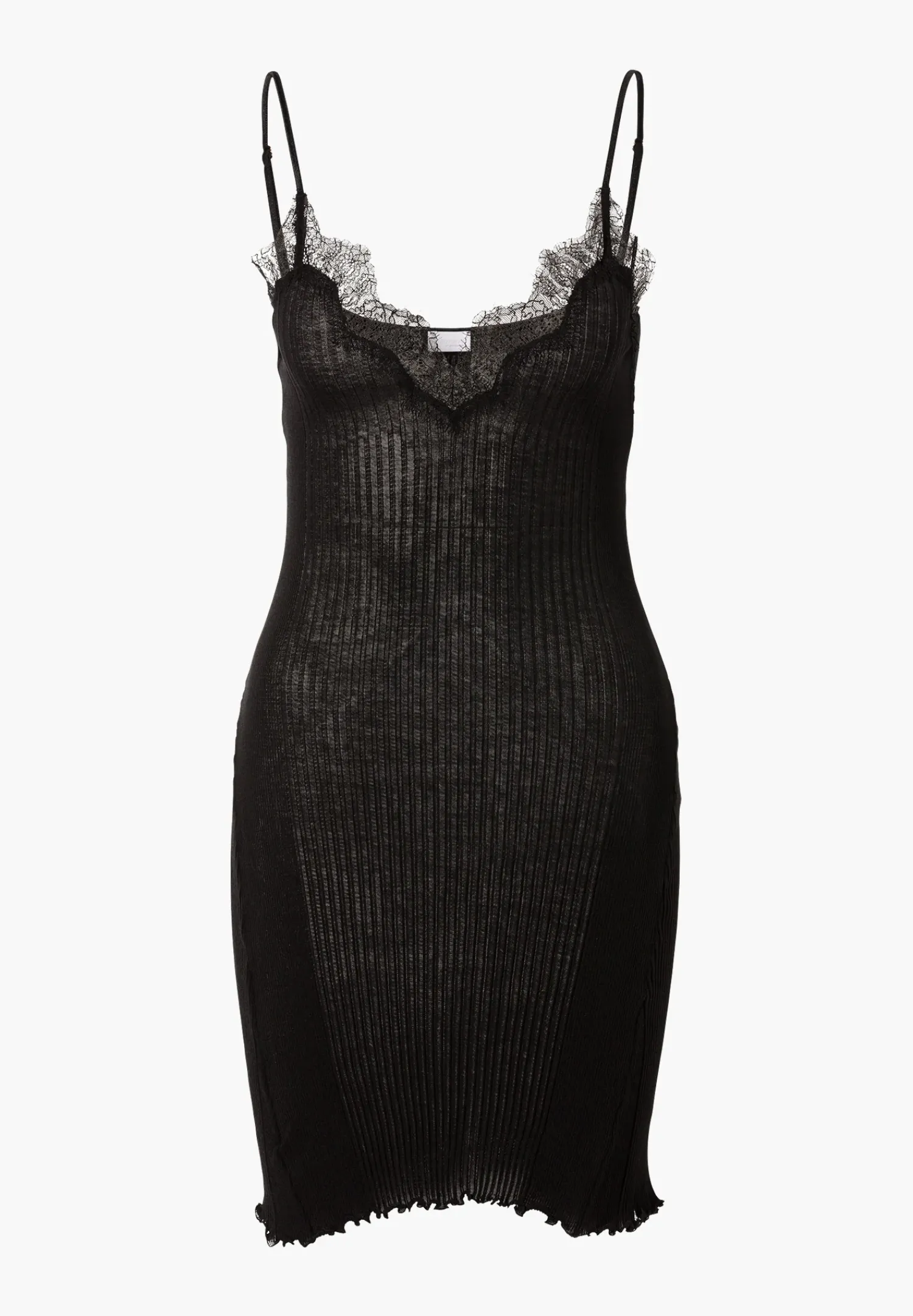 Einzigartig Dunner Richelieu-Feinrippstoff Mit Zwei Unterschiedlichen Breiten Rippen, Ausgeschmuckt Mit Floraler, Zarter Eye-Lash-Spitze. Das Neglige Mit Spaghetti-Tragern Fur Damen Uberzeugt Durch Einen Gewellten V-Ausschnitt, Der Mit Passender Wimpernspitze Besetzt Ist. In Der Mitte Des Ausschnitts Uberkreuzen Sich Die Spitzendetails. Auf Der Vorderseite Sind Ausserdem Die Armausschnitte Mit Spitze Verziert. Der Ruckenausschnitt, Die Ruckseite Der Armausschnitte Und Die Dunnen Spaghetti-Trager Werden Von Einem Glanzenden Band Eingefasst. Die Tragerlange Lasst Sich Mit Hilfe Der Kleinen, Goldenen Versteller Auf Der Ruckseite Individuell Einstellen. Fur Eine Korperumschmeichelnde Passform An Der Hufte Wurde Seitlich Jeweils Ein Zusatzlich Ein Grosses Dreieck Aus Breitem Feinrippstoff Eingesetzt. Dadurch Erhalt Das Neglie Einen Leicht Ausgestellten Saum. Dieser Ist Durch Eine Besondere Nahtechnik Leicht Gekrauselt.