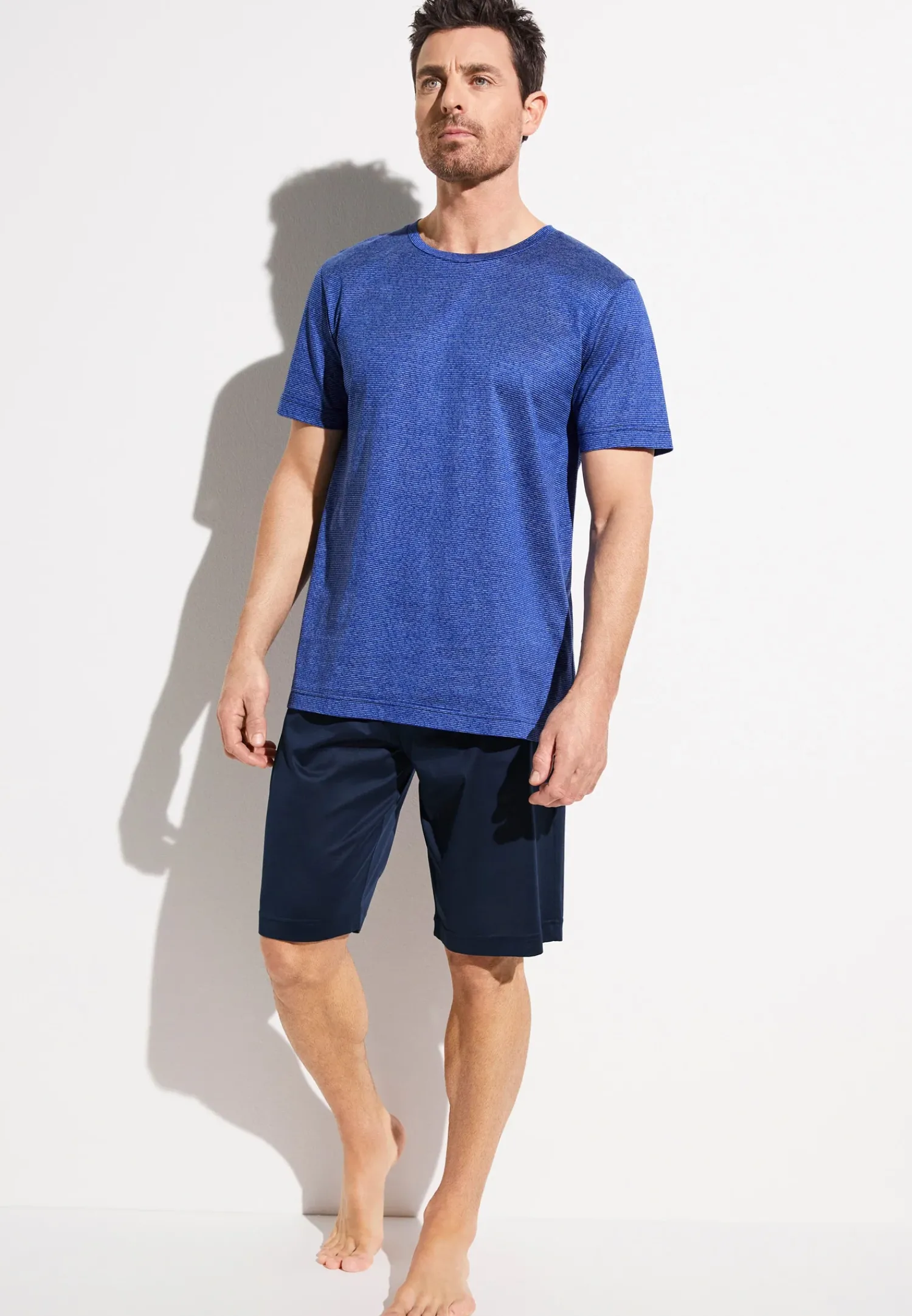 Edler Schimmer Trifft Auf Schmale Streifen In Unifarben Und Melange. Der Kurze Schlafanzug Fur Herren Uberzeugt Durch Den Seidigen Glanz. Das Gestreifte Schlafanzug-Oberteil Mit Kurzen Armeln Besitzt Einen Rundhals-Ausschnitt. Die Streifen Sind Detailreich Gestrickt: Es Wechseln Sich Sehr Dunne Streifen In Uni Mit Dezenten Melange-Streifen Ab. Der Saum Am Eingesetzten Halsausschnitt Ist Ebenfalls Gestreift. Die Pyjama Shorts Sind Einfarbig, Genau Passend Zur Farbe Des Dessins. Die Kurze Hose Besitzt Einen Verdeckten, Elastischen Bund, Ist Gerade Geschnitten Und Sehr Bequem Zu Tragen.