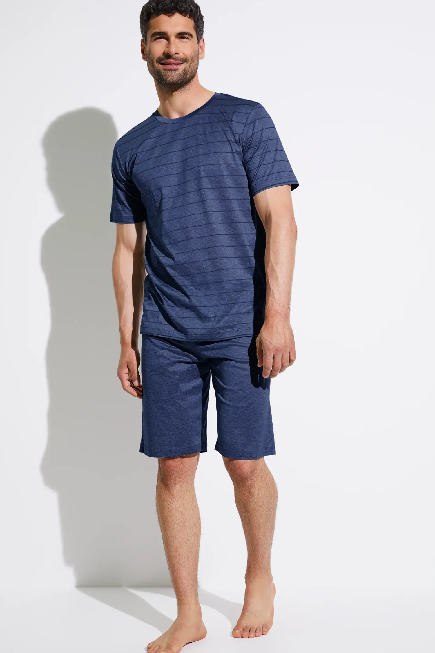 Edler Schimmer Trifft Auf Schmale Streifen In Unifarben Und Melange. Der Kurze Schlafanzug Fur Herren Uberzeugt Durch Den Seidigen Glanz. Das Gestreifte Schlafanzug-Oberteil Mit Kurzen Armeln Besitzt Einen Eingesetzten Rundhals-Ausschnitt. Die Streifen Sind Detailreich Gestrickt: Es Wechseln Sich Sehr Dunne Streifen In Uni Mit Breiten Melange-Streifen Ab. Die Pyjama Shorts Sind Einfarbig, Genau Passend Zur Farbe Des Dessins. Die Kurze Hose Besitzt Einen Verdeckten, Elastischen Bund, Ist Gerade Geschnitten Und Sehr Bequem Zu Tragen.