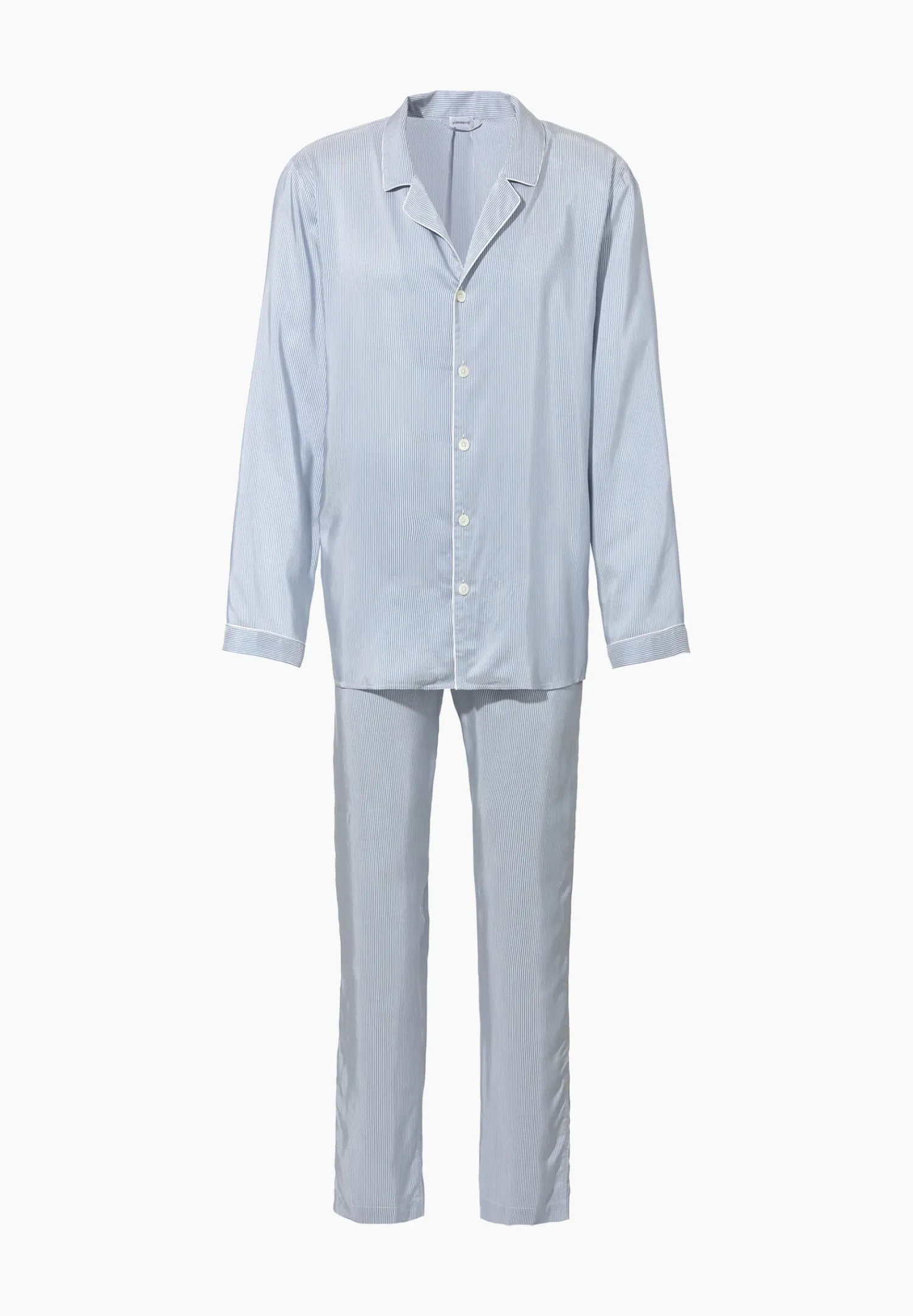 Kuhle, Glatte Viskose Wird Gemeinsam Mit Luxurioser Seide Zu Besonders Ebenmassigen Stoff Gewebt Und Mit Einem Dezenten, Schmalen Langsstreifenmuster Verziert. Der Lange Pyjama Fur Herren Mit Langen Armeln Und Langer Hose Uberzeugt Als Kleines Highlight Mit Dezenten Paspelierungen In Weiss. Das Schlafanzug-Oberteil Besitzt Einen Reverskragen Und Wird Per Durchgehender Knopfleiste Mit Funf Perlmutt-Knopfen Geschlossen. Der Kragen Und Die Umschlage An Den Armelenden Sind Mit Der Weissen Paspel Abgesetzt. Auf Der Ruckseite Des Hemds Ist Eine Vom Kragen An Abwarts Fliessende Falte Angebracht. Die Lange Schlafhose Ist Gerade, Weit Und Locker Geschnitten. Das Verdeckte Bundband Ist Weich Und Flexibel Und Verlauft Bis Fast An Die Vordere Mitte. Auf Der Vorderseite Besitzt Die Hose Einen Eingriff, Der Mit Einem Sichtbaren Sowie Einem Unsichtbaren Knopf Verschlossen Wird. Der Schnitt Ist Locker Und Bequem, Der Webstoff Ist Fest Und Nicht Elastisch.