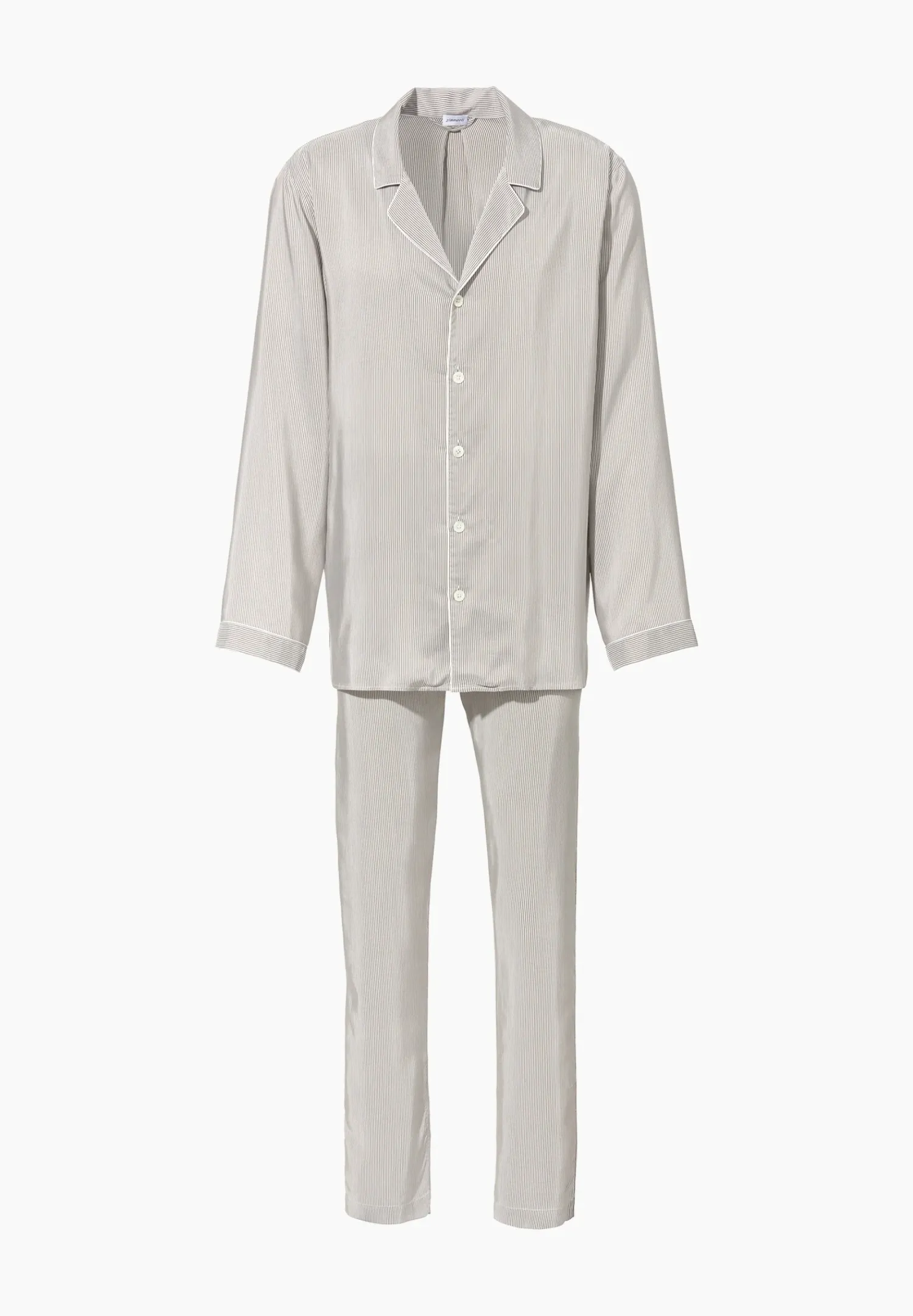 Kuhle, Glatte Viskose Wird Gemeinsam Mit Luxurioser Seide Zu Besonders Ebenmassigen Stoff Gewebt Und Mit Einem Dezenten, Schmalen Langsstreifenmuster Verziert. Der Lange Pyjama Fur Herren Mit Langen Armeln Und Langer Hose Uberzeugt Als Kleines Highlight Mit Dezenten Paspelierungen In Weiss. Das Schlafanzug-Oberteil Besitzt Einen Reverskragen Und Wird Per Durchgehender Knopfleiste Mit Funf Perlmutt-Knopfen Geschlossen. Der Kragen Und Die Umschlage An Den Armelenden Sind Mit Der Weissen Paspel Abgesetzt. Auf Der Ruckseite Des Hemds Ist Eine Vom Kragen An Abwarts Fliessende Falte Angebracht. Die Lange Schlafhose Ist Gerade, Weit Und Locker Geschnitten. Das Verdeckte Bundband Ist Weich Und Flexibel Und Verlauft Bis Fast An Die Vordere Mitte. Auf Der Vorderseite Besitzt Die Hose Einen Eingriff, Der Mit Einem Sichtbaren Sowie Einem Unsichtbaren Knopf Verschlossen Wird. Der Schnitt Ist Locker Und Bequem, Der Webstoff Ist Fest Und Nicht Elastisch.