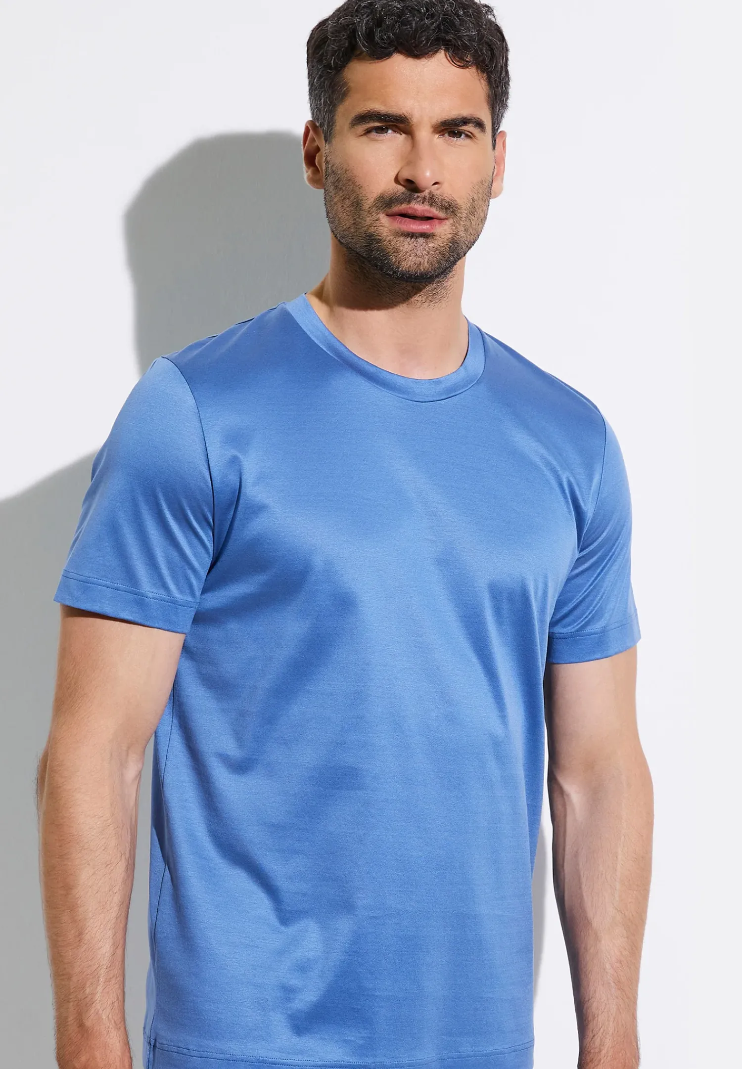 Edler Schimmer Dank Zweifacher Merzerisierung Der Garne. Das T-Shirt Fur Herren Uberzeugt Mit Einem Eingesetzten Rundhals-Ausschnitt. Der Saum Und Die Armelenden Sind Mit Einer Doppelten Naht Abgesetzt. Der Schnitt Ist Bequem, Locker Und Bietet Viel Bewegungsfreiheit.